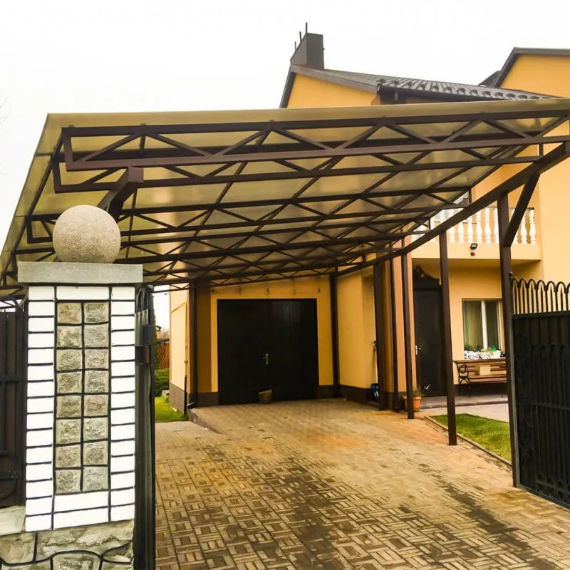 Навесы из поликарбоната: это конструкции, которые состоят из металлического каркаса и пластиковых панелей из поликарбоната. Они обеспечивают хорошую защиту от солнца, дождя и снега, и могут быть использованы как на крыльце, так и на террасе.