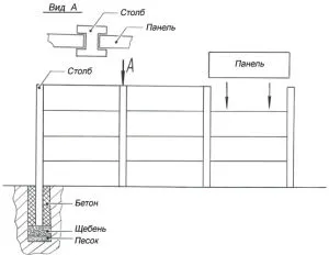 Столбы устанавливаются на расстоянии равному длине секции будущего забора, желательно не большим, чем 2,5 м. Для них пробуриваются ямы, глубина которых должна быть не меньше глубины промерзания почвы. На дно каждой ямы засыпается песчаная подушка толщиной до 20 см. Сверху подушка засыпается щебенкой такой же толщины. Все тщательно утрамбовывается и заливается водой.