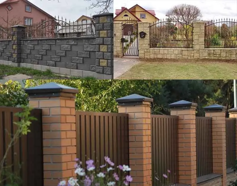 Альтернативным материалом, доступным, но менее презентабельным, стал бетон. Сегодня технологии бетонных растворов позволяют получать материал, по декору и прочностным характеристикам способный составить достойную конкуренцию и кирпичу и натуральному камню. Бетонные блоки для столбов забора, поверхность которых имитирует структуру различных горных пород, древесину, кирпичную кладку с успехом заменили традиционные материалы.