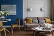 В концепции интерьера прослеживается тема геометрии. Это керамическая плитка, обои и поддерживающий их кухонный фартук. На полу в кухне, на лоджии и в ванной использовали плитку шеврон. Пространство как бы объединено отделкой. Дополняет оформление яркая мебель в синих и желтых тонах.