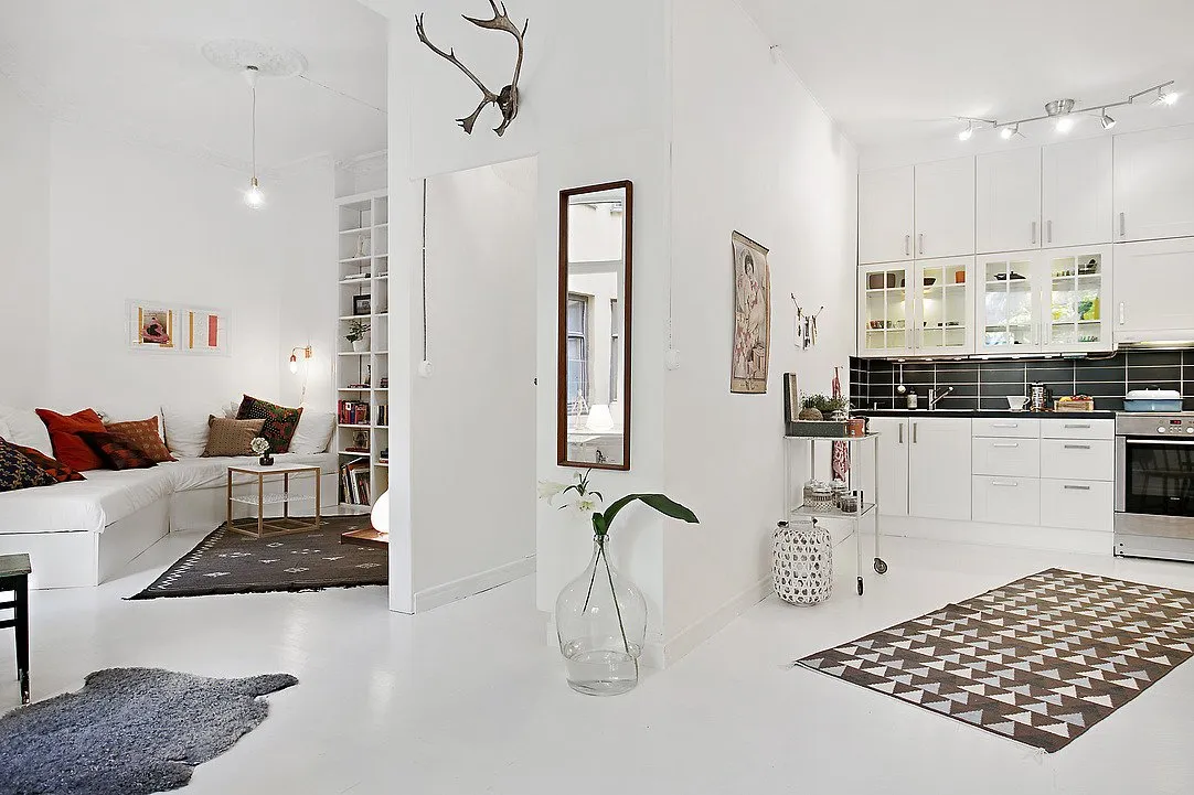 Северные интерьеры квартир-студий предполагают особенное распределение мебели. Кухонный гарнитур в зоне приготовления еды не имеет верхней части шкафчиков. Их заменяют открытыми полками и стеллажами. По центру ставят небольшой диван или софу без спинки. Рядом два кресла на тонких ножках. Гардероб помещают в зону отдыха или прихожую.
