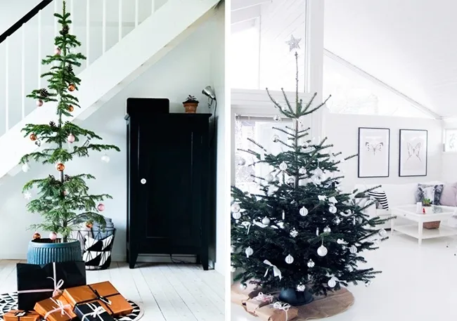 - Скандинавский. Если основной цвет в интерьере белый, елку можно украсить в скандинавском стиле. Для него характерно изобилие белого, дополненного нейтральными оттенками. Можно использовать искусственный снег для того, чтобы нанести на ветки ели.