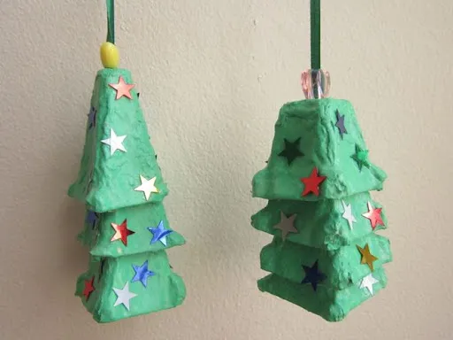 Необычные елочки, которые можно подвесить надо рабочими столами, очень просто сделать из упаковки для яиц. Такие картонные лотки с ячейками есть в каждом доме.