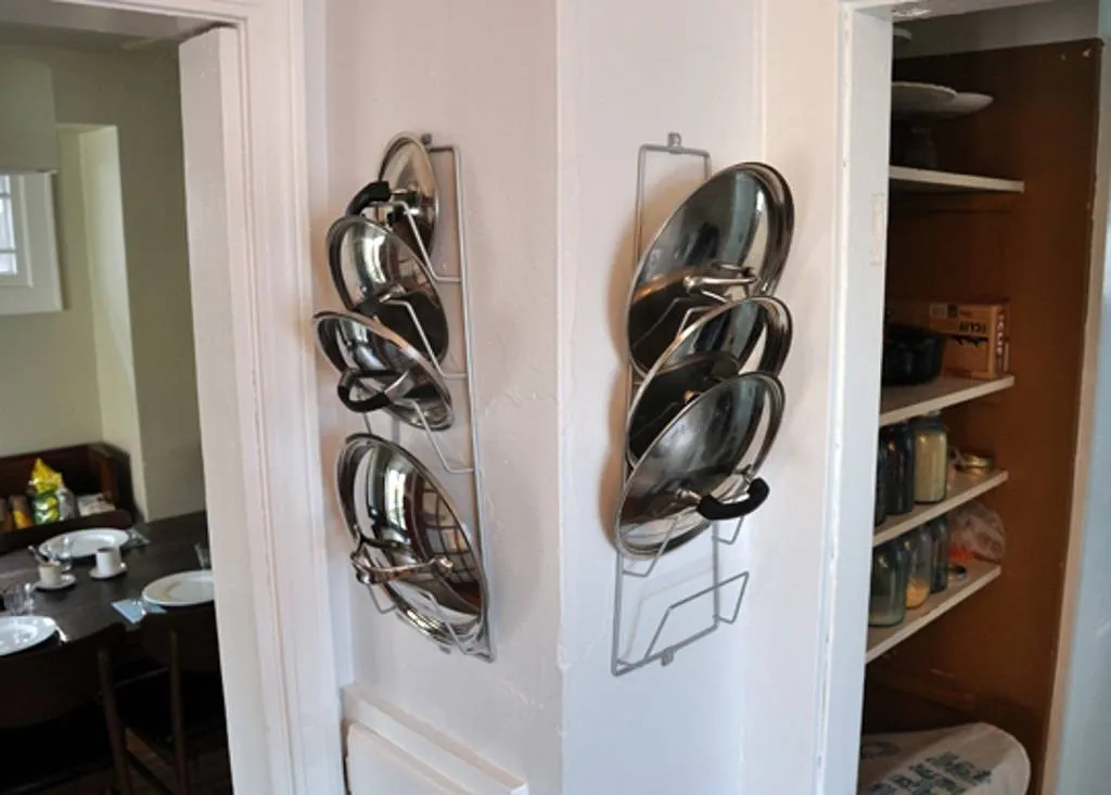 Но выход есть, и он довольно бюджетный. Это специальные вешалки и полки, на которых крышки можно разместить лесенкой. Устроить их можно на стене и даже на дверце шкафчика с внутренней стороны.