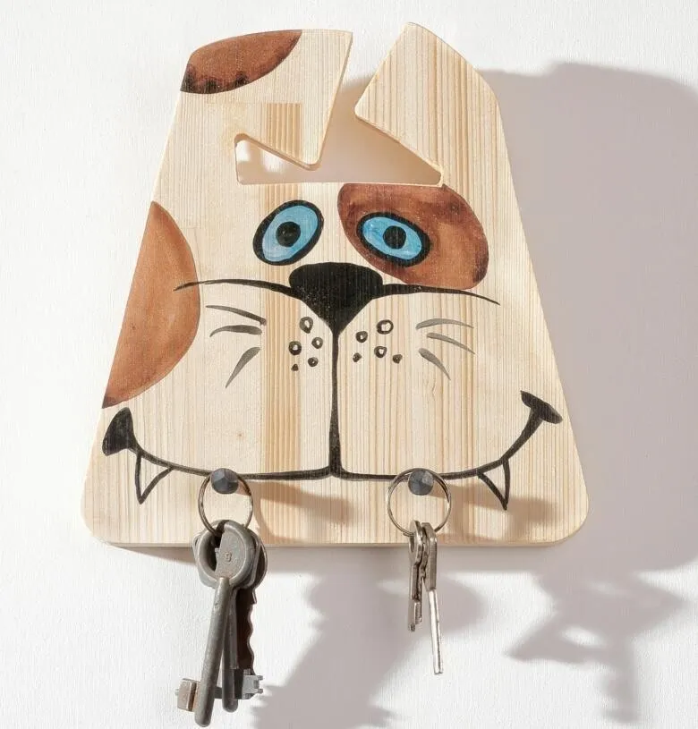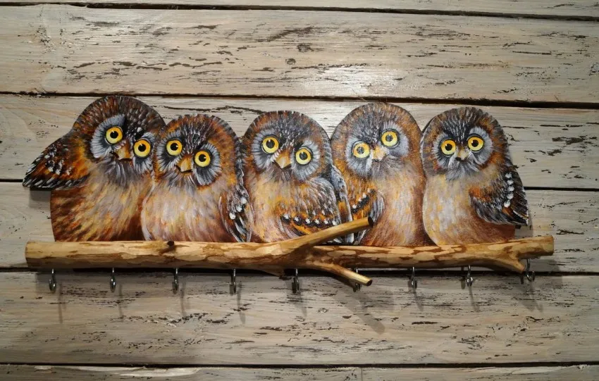 Очевидно, что фанера более удобна для работы. Ведь это уже обработанный материал, нужно только вырезать нужную форму. Легонько пройтись наждачкой, обрабатывая края изделия, покрасить и нацепить крючки.