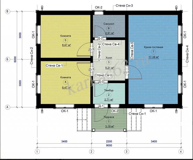 Проект одноэтажного каркасного дома 8 — 11 м.