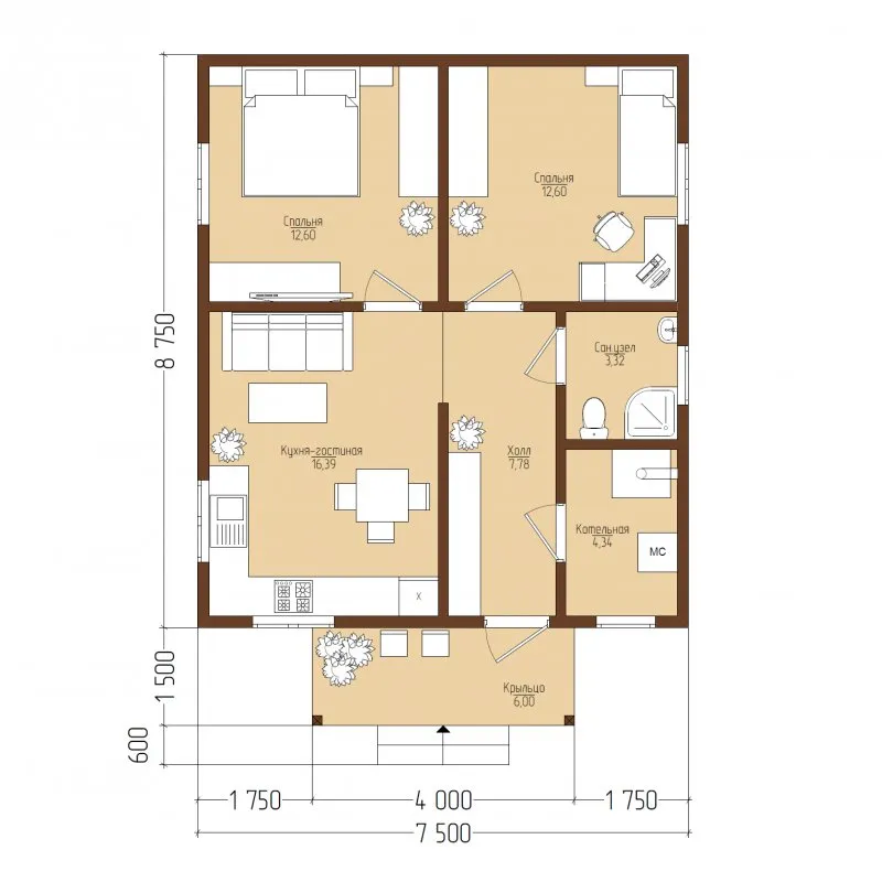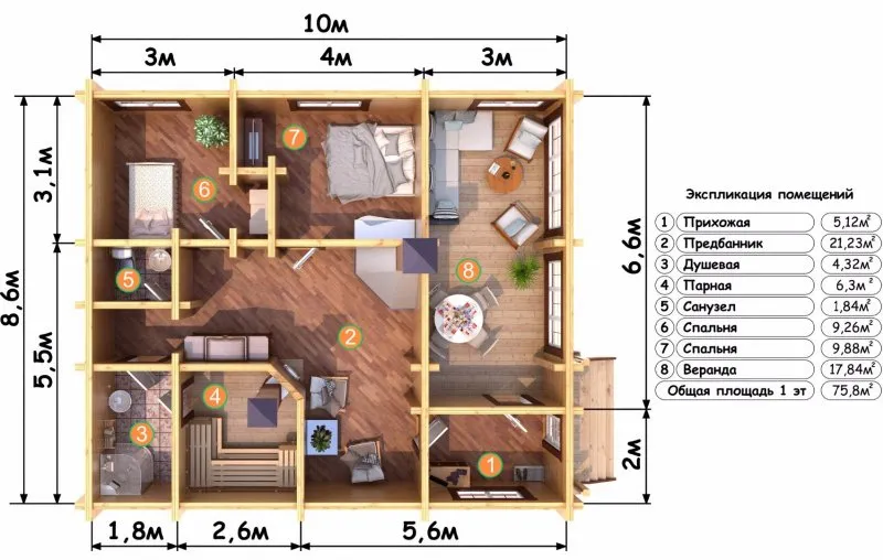 Планировка дома 6 на 8 одноэтажный из бруса с печкой