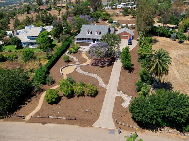 Большую приватность даст вход в дом, расположенный с противоположной от въезда стороны. Часто такое расположение входа делают, если он один. В этом случае отсутствует разделение на парадную и приватные части. Дом, как правило, размещен близко к передней границе, независимо от наличия гаража. Перед ним располагают красиво оформленный палисадник. С одной или двух сторон идут обходные дорожки, ведущие ко входу и к центральной части участка. При наличии гаража одну из дорожек можно сделать хозяйственным проходом и расположить его как раз со стороны гаража.