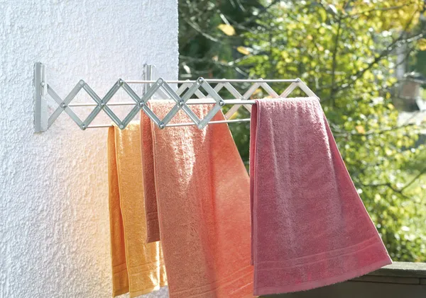 Если у вас достаточно просторный балкон, так же можно воспользоваться настенной вешалкой. Старые конструкции выдерживали небольшой вес белья, но со временем стали выпускаться усовершенствованные модели в несколько ярусов и с пружинным механизмом. На моделях нового поколения можно сушить сразу много вещей, не опасаясь, что она деформируется. С противоположной стороны такого устройства располагаются крючки для фиксации веревок. Когда балконная вешалка для сушки белья сложена и веревки спрятаны в барабане, крючки используются для других целей.